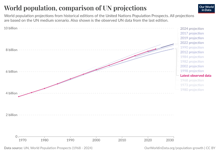 Hannah Ritchie (2023) - “The UN has made population projections for more than 50 years – how accurate have they been?” Published online at OurWorldinData.org. Retrieved from: 'https://search-sync-local-query.owid.pages.dev/population-projections' [Online Resource]BibTeX citation