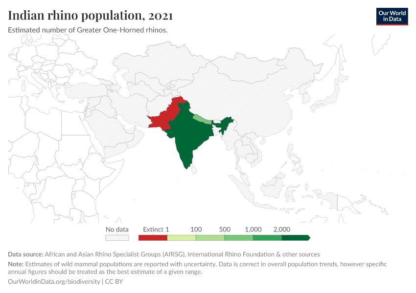 By the mid-20th century, there were very few Indian Rhinos left in the world. It’s estimated (with larger uncertainty since it predates regular surveying) that there were only 40 individuals left.
