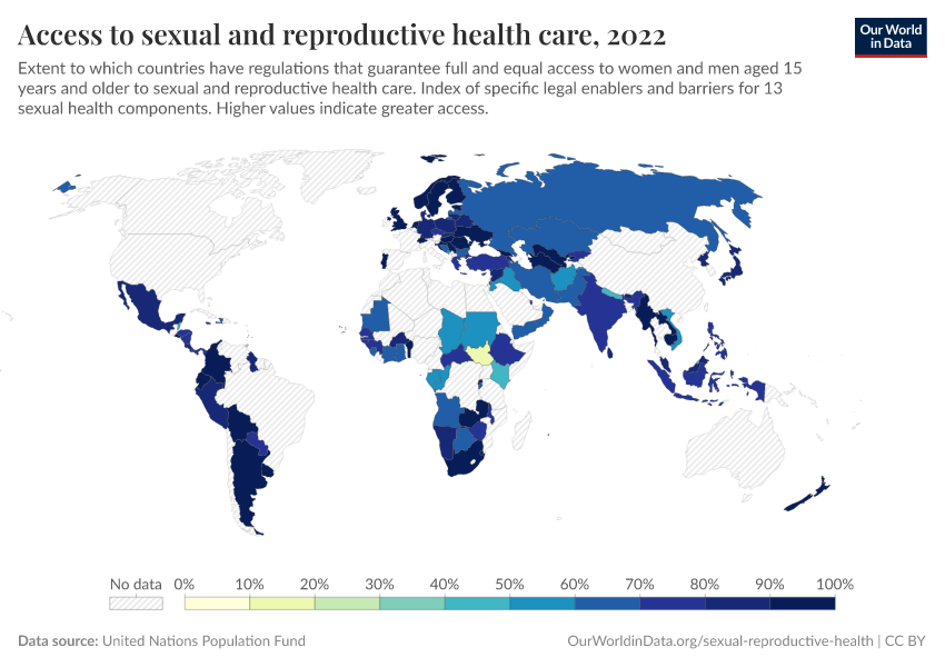 The interactive visualization shows the extent to which a given country has laws and regulations that guarantee full and equal access to women and men aged 15 years and older to sexual and reproductive health care, information and education. The score for each country is calculated based on 13 components, including access to maternity care and contraception. This measure focuses only on the presence of laws and regulations, not the extent of their implementation.
