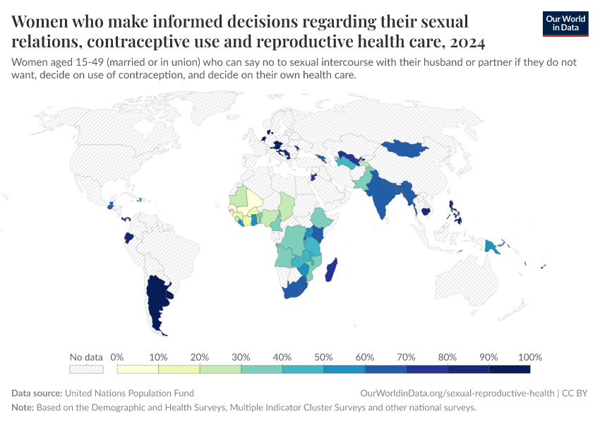 This is shown here as the percentage of women aged 15-49 years old that are married or in union who make their own informed decisions regarding sexual relations and reproductive healthcare.