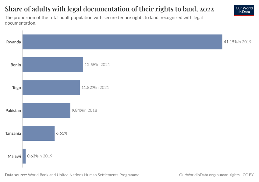 The interactive visualizations show data for this indicator. The first chart shows data on indicator 1.4.2(a) for the share of adults with legal documentation of their rights to land, and the second chart shows data on indicator 1.4.2(b) for the share of individuals who perceive their rights to land as secure.