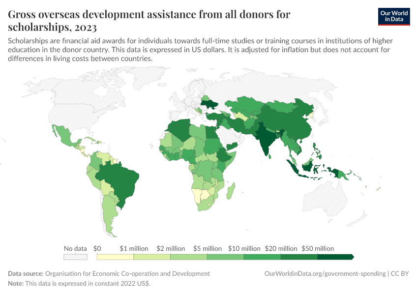 This indicator is disbursements of official development assistance (ODA) for scholarships, defined as financial aid awards for individual students and contributions to trainees, where students and trainees are nationals of recipient countries.