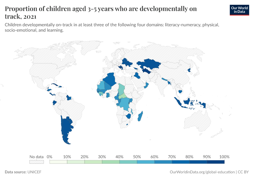 Since internationally comparable data for this indicator is not currently available, this is measured by the United Nations through a proxy indicator defined as the proportion of children aged 36-59 months in each country who are developmentally on-track in at least three of the following four domains: literacy-numeracy, physical, socio-emotional and learning.