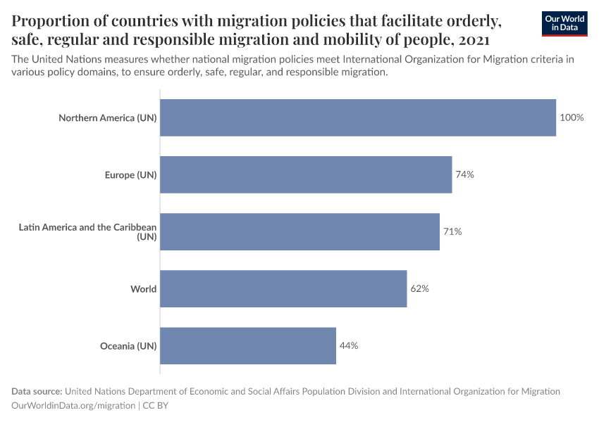Although this indicator is defined in terms of the number of countries, the United Nations measures this indicator in terms of the extent to which country migration policies meet International Organization for Migration (IOM) criteria in a variety of policy domains. These criteria are based on the principles of the IOM’s Migration Governance Framework, which seeks to promote well-managed migration that is beneficial to all.