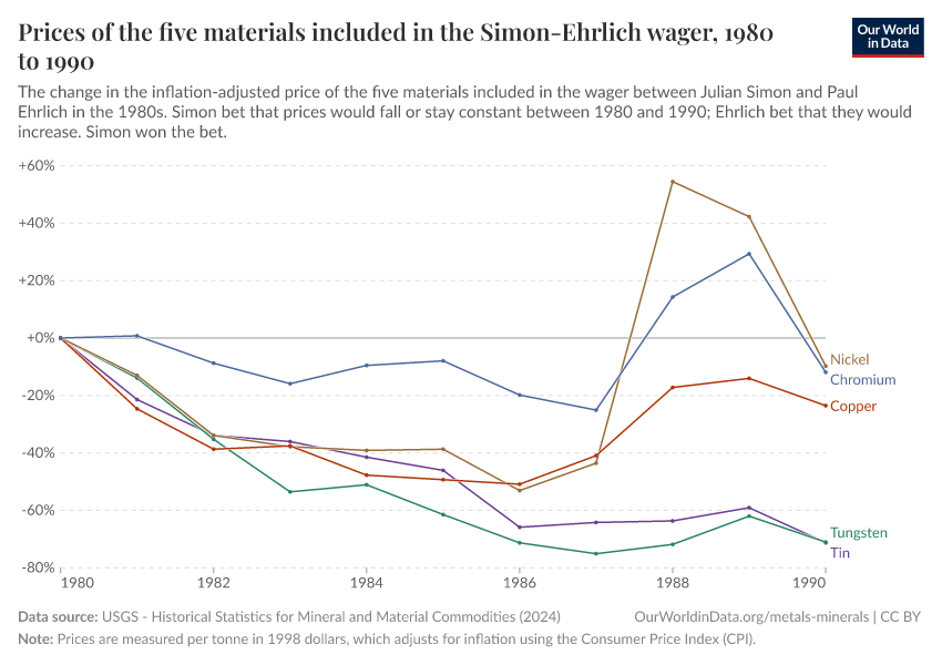 Another key point is that much of Ehrlich’s work was focused on food supply. He predicted widespread food shortages and large-scale famines (which did not come true; the food supply per person has increased since the 1980s). So it’s not obvious to me why he agreed to a bet on materials or why he chose those five ones in particular.