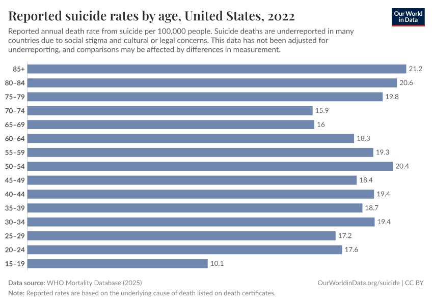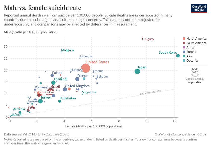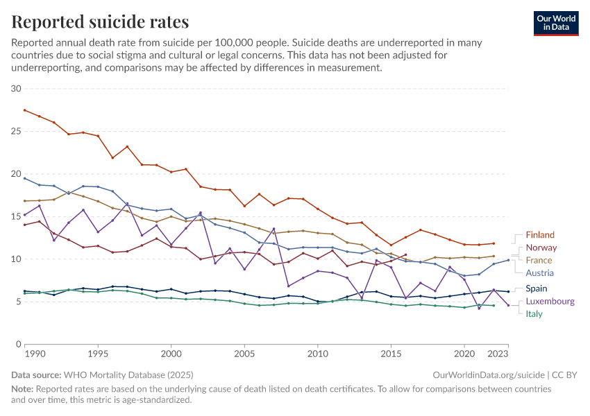 Saloni Dattani, Lucas Rodés-Guirao, Hannah Ritchie, Max Roser, and Esteban Ortiz-Ospina (2023) - “Suicides” Published online at OurWorldinData.org. Retrieved from: 'https://search-sync-local-query.owid.pages.dev/suicide' [Online Resource]BibTeX citation