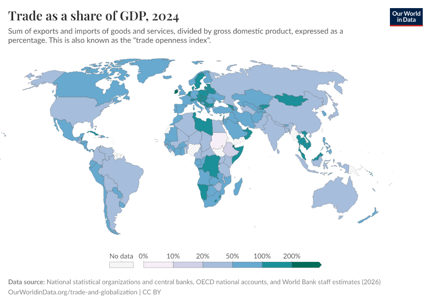 Trade openness (exports plus imports as a share of gross domestic product) shows how large a country’s cross-border flows are relative to the size of its domestic economy. The map here plots this metric and highlights large cross-country differences. International trade is much smaller relative to the domestic economy in the US than in almost all European countries, for example. This is partly explained by the large volume of trade that takes place within the European Union.