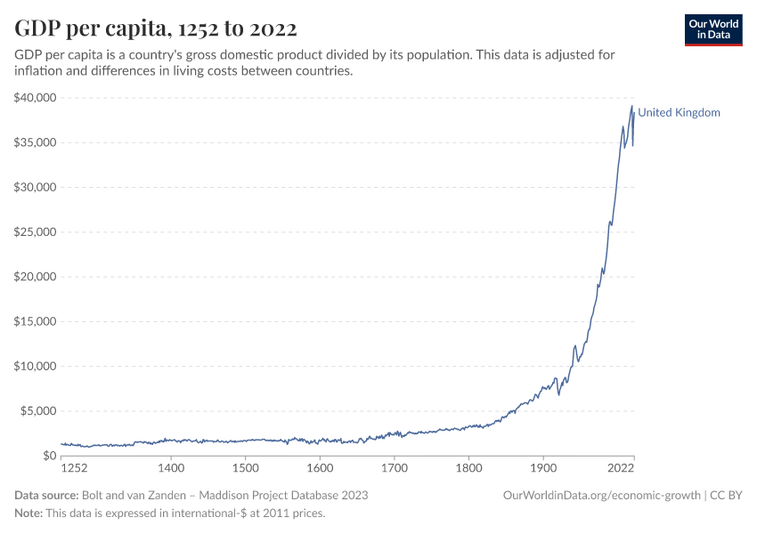 One of the very first countries to achieve sustained economic growth was the United Kingdom. In this chart, we see the reconstructions of GDP per capita in the UK over the last centuries.