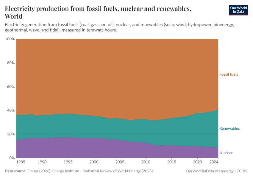 One sector where we have developed several alternatives to fossil fuels is electricity. Nuclear power and renewables emit far less carbon (and are much safer) than fossil fuels. Still, as the last chart shows, their share in global electricity production hasn't changed much: only increasing from 37% to 41% over the last three decades.